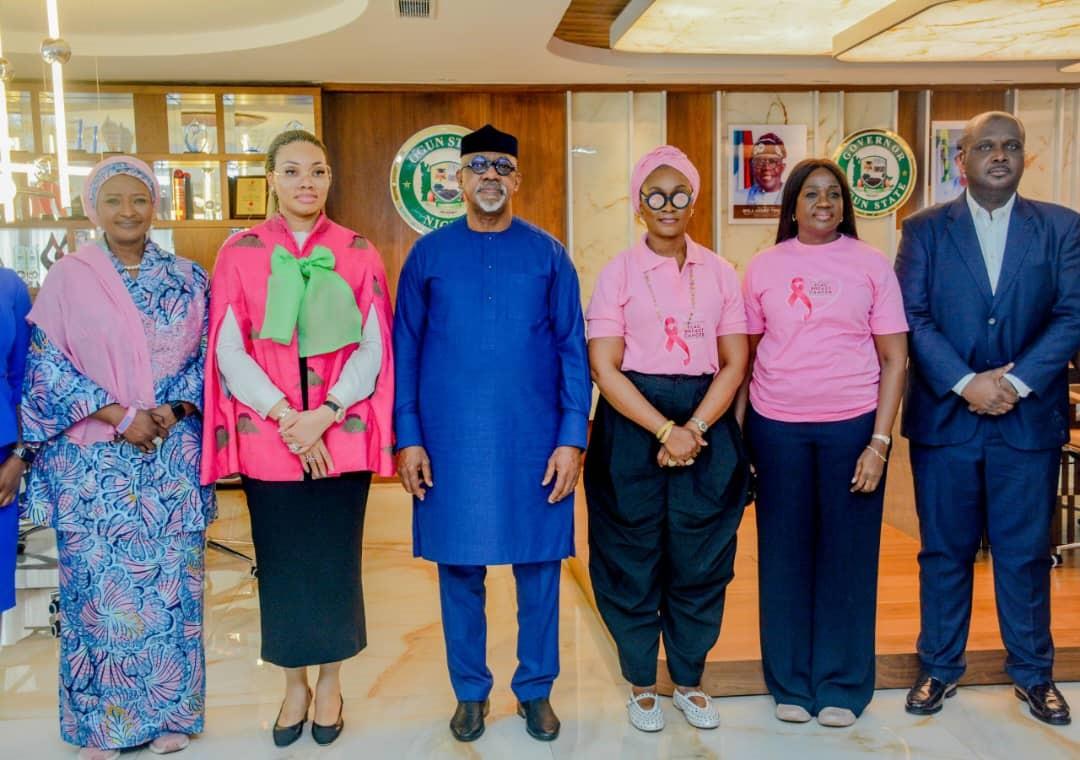 L-R: Wife of the Minister of Budget and National Planning, Dr Zainab Bagudu; wife of the Governor of Imo State, Mrs Chioma Uzodimma; Ogun State Governor, Prince Dapo Abiodun; wife of the Governor, Mrs Bamidele Abiodun; Commissioner for Health, Dr. Tomi Coker and the General Manager, Roche Healthcare and Pharmaceutical Company, Dr. Ladipo Hameed, during a courtesy visit to the governor in his office